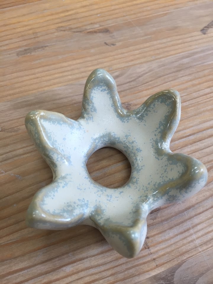 Somehow a crack line formed along the base of the neck after the first bisque. Fortunately however, the ceramics shop owner was able to apply the glaze in such a way that the crack is virtually unnoticeable. The name of the glaze is "Sky Barley."