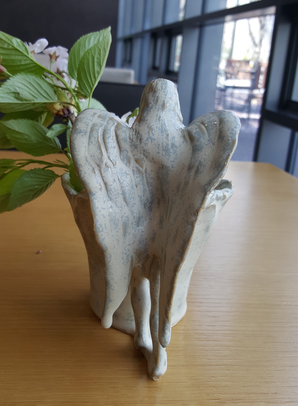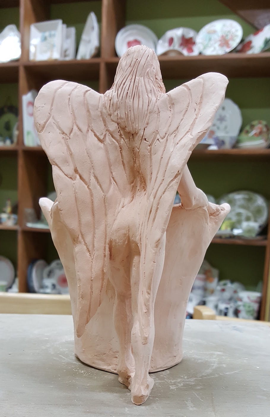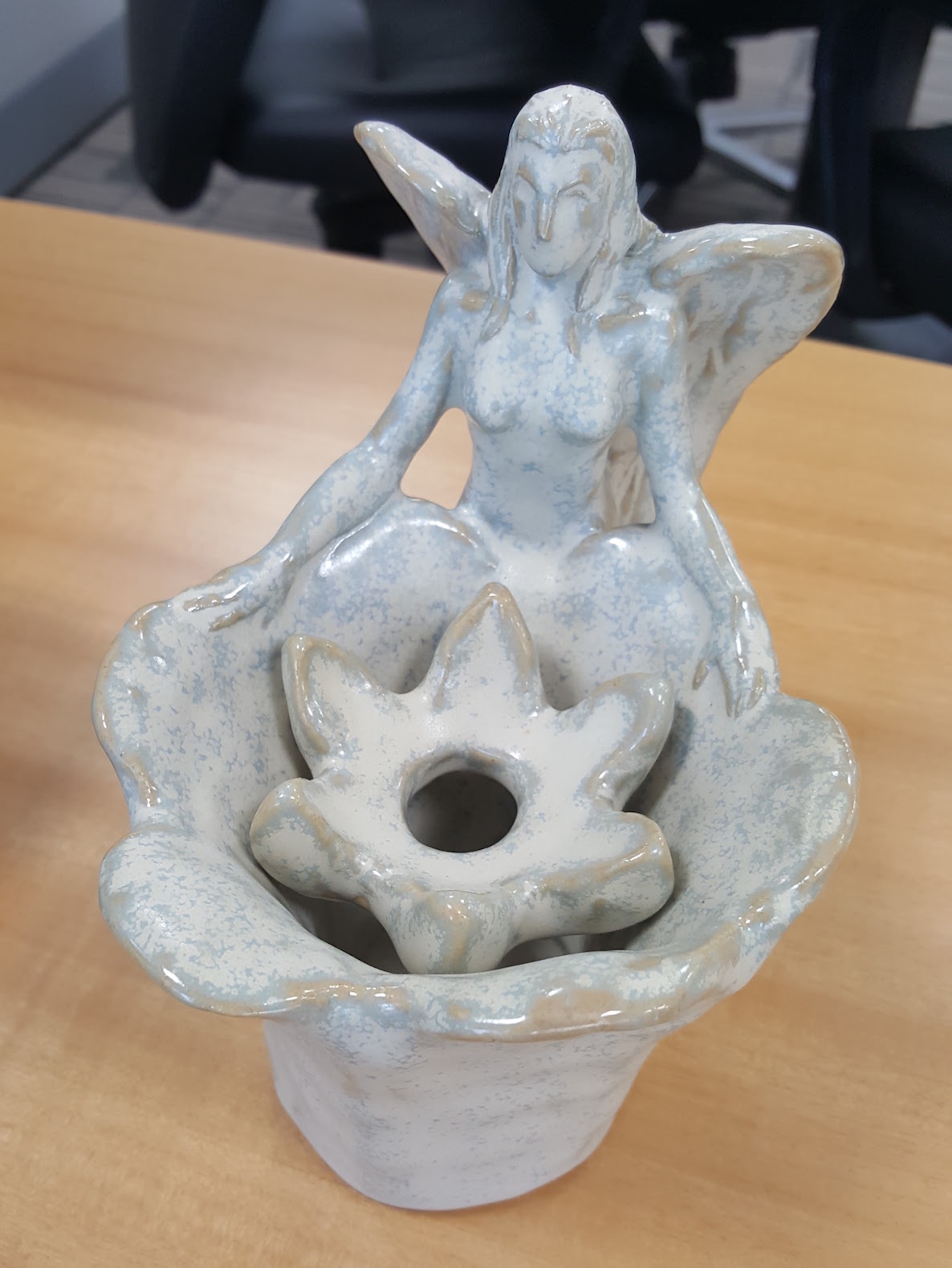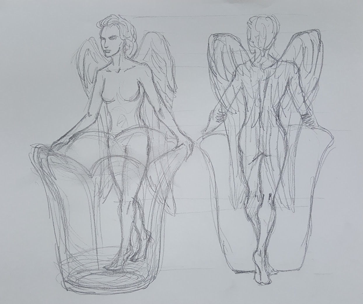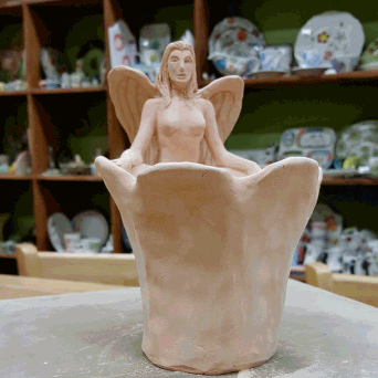 A friend suggested I continue my chimeric female sculpture series with an angel. As usual I started with a concept sketch and adapted it along the way. This piece took much longer than I had anticipated, and I actually ran out of time. Based on my experience with the mermaid mug and the water bearer, I didn't bother adding a whole lot of detail to the face since most of it gets obscured by the glaze.