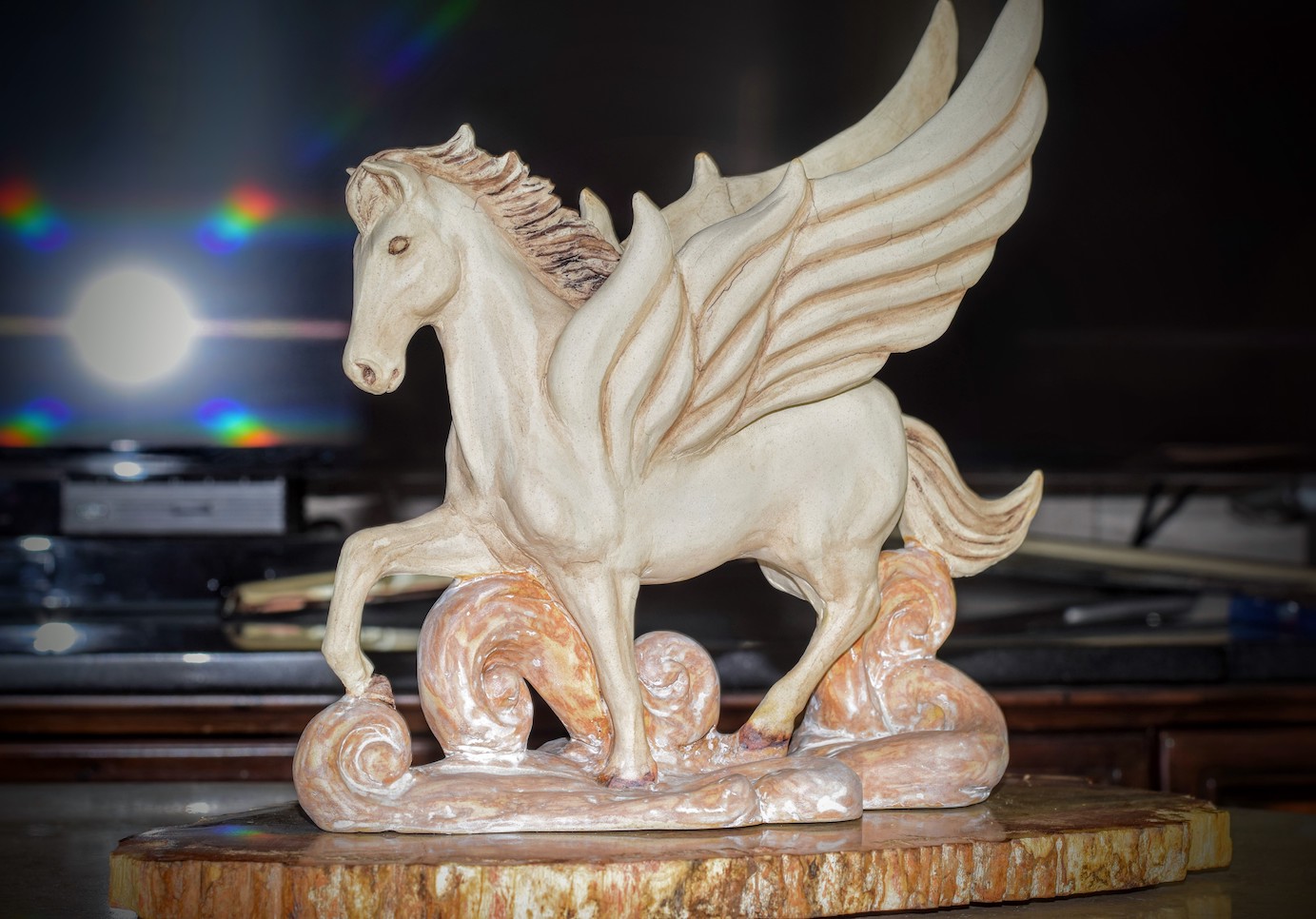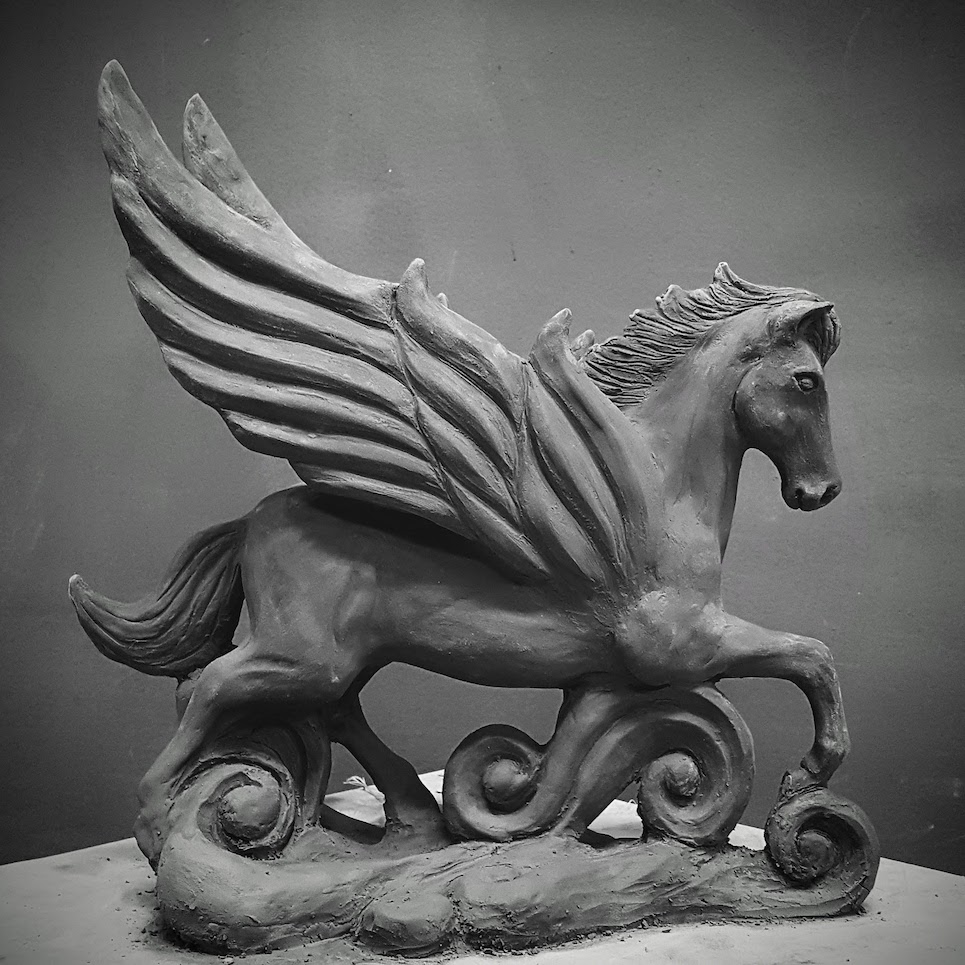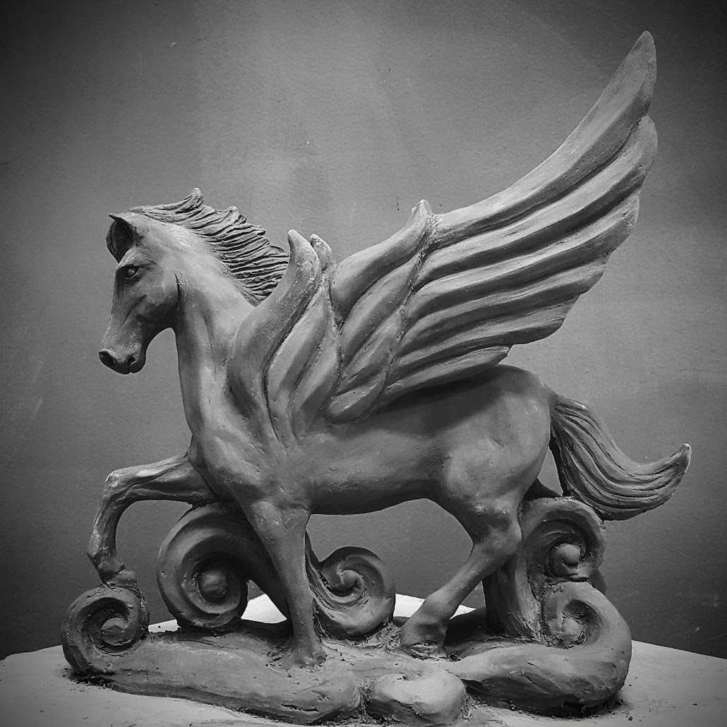 In Greek mythology, Pegasus was sired by Poseidon and sprang from the gorgon Medusa's blood upon being decapitated by Perseus. The loyal Pegasus carried thunderbolts from Olympus to Zeus until he was tamed by Bellerophon and assisted the hero in slaying the Chimera. Like dragons, mythological winged or flying horses are also present in other cultures: Buraq in Islam, Chollima in Korea, Tianma in China, and the steed of the Norse Valkyries. I think the concept of flying horses were naturally to early man what our vision is today for flying cars. Artistically, this majestic creature evokes beauty, strength, and freedom. My first attempt at Pegasus shattered during the bisque firing (see clay version below), so I sculpted a second larger, and I think a much improved version. As always, thanks to the Ceramic Art Studio and Shop, where I am given both guidance and the freedom to explore my creative outlet.