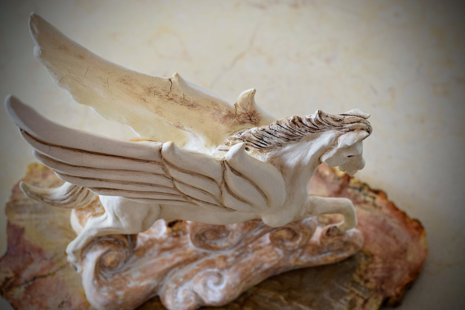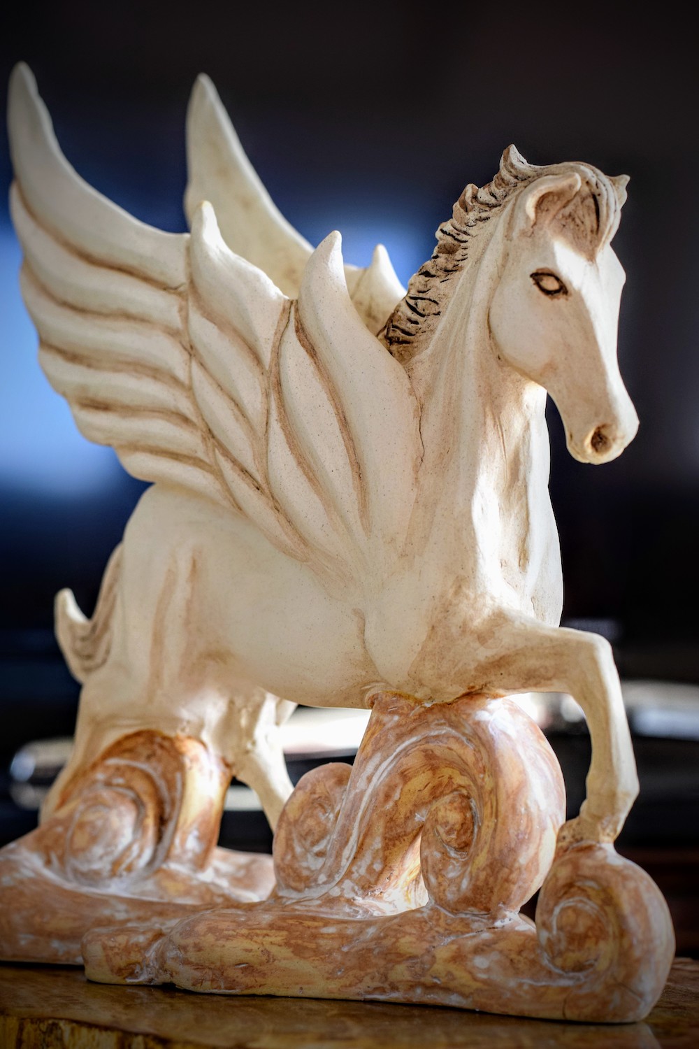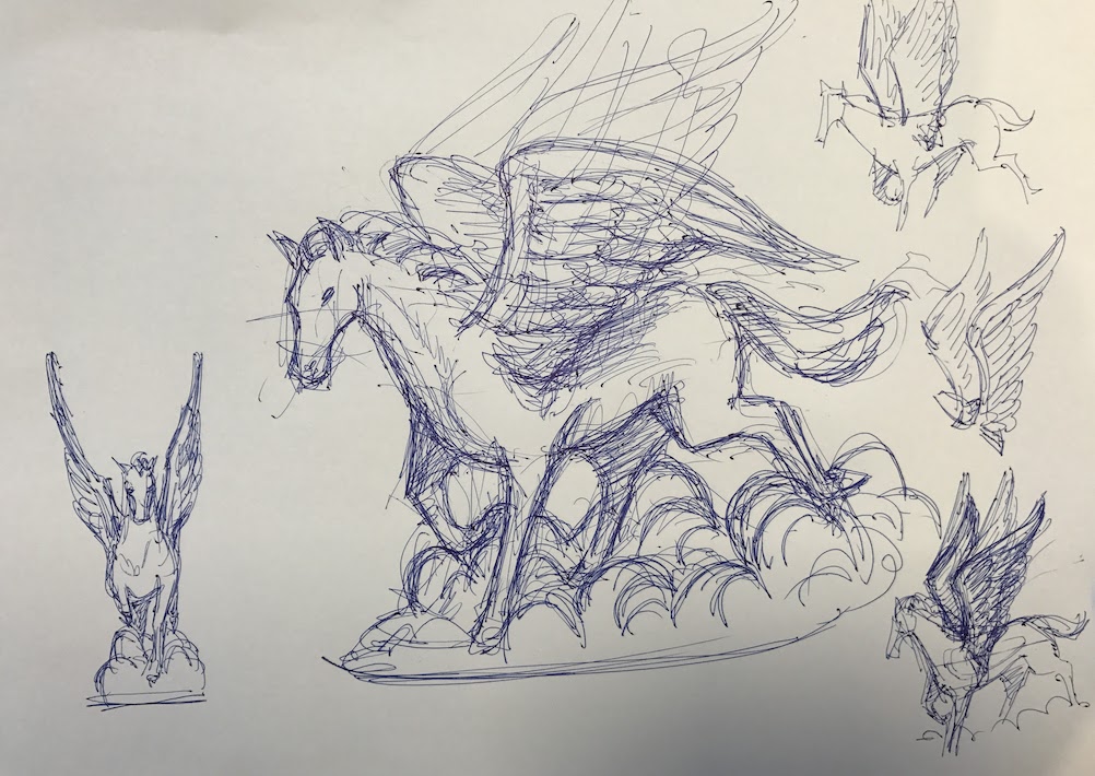 In Greek mythology, Pegasus was sired by Poseidon and sprang from the gorgon Medusa's blood upon being decapitated by Perseus. The loyal Pegasus carried thunderbolts from Olympus to Zeus until he was tamed by Bellerophon and assisted the hero in slaying the Chimera. Like dragons, mythological winged or flying horses are also present in other cultures: Buraq in Islam, Chollima in Korea, Tianma in China, and the steed of the Norse Valkyries. I think the concept of flying horses were naturally to early man what our vision is today for flying cars. Artistically, this majestic creature evokes beauty, strength, and freedom. My first attempt at Pegasus shattered during the bisque firing (see clay version below), so I sculpted a second larger, and I think a much improved version. As always, thanks to the Ceramic Art Studio and Shop, where I am given both guidance and the freedom to explore my creative outlet.